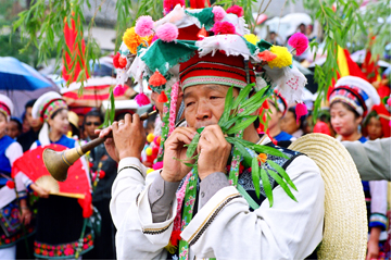 從整套太邑者么白族婦女服飾特征上看,是融合彝族服飾喜藍(lán)尚黑、色彩對(duì)比強(qiáng)烈的文化特點(diǎn),又從服飾的每一道圖案、紋飾來(lái)看,深受彝族遠(yuǎn)古圖騰崇拜的影響,原因是彝族人民世代居住在高山密林中生活,帶刺的枝條,有毒的樹(shù)枝,還有各種各樣的藤條荊刺;常常給他們的行走和生活帶來(lái)困難,所以這些藤條荊刺對(duì)他們來(lái)說(shuō)簡(jiǎn)直成了不可抗御的神靈之物,于是產(chǎn)生“以物降物”的意思,模仿藤條荊刺的形狀在衣服易損的部位繡上藤條紋飾,其意思是說(shuō):你那么厲害的來(lái)傷害我,我也用同樣厲害的藤條荊刺對(duì)付你,這在精神上是一種力量,客觀上是所繡衣紋除了美觀之外,更主要的是為了加固衣服的牢實(shí)程度,更顯得服飾整體和諧及統(tǒng)一的美感,這就是融合了彝族服飾文化的內(nèi)涵而形成獨(dú)自風(fēng)格的山地者么白族服飾,同時(shí)也是山區(qū)白族服飾中較為典型的代表之一。