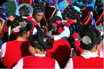 以大理市為主要代表的洱濱區(qū)白族服飾。如周城、喜洲、挖色等白族服飾,他們世代伴水而居,生活環(huán)境十分優(yōu)越,服飾給人一種清新明快的感覺(jué)。在很大程度上折射出這種環(huán)境的優(yōu)越性,周城村白族男服飾過(guò)去的穿著較為復(fù)雜,纏白布包頭,上衣穿立領(lǐng)對(duì)襟布紐衣,俗稱(chēng)“三滴水”,最里的一件穿白色、中間一件穿藍(lán)色、最外一件穿黑色或是藏青色的外衣,三件衣服都是敞開(kāi)著,露出內(nèi)穿的兜肚,外穿一件麂皮或山羊皮的領(lǐng)褂,下穿白或藍(lán)色大襠褲,腳穿布底剪口鞋。肩掛繡花掛包。而現(xiàn)在的男裝基本與漢族相同,平時(shí)需要穿戴的民族服裝也是改良過(guò)較為簡(jiǎn)潔的男裝,只有在重大節(jié)日的時(shí)候才能看到傳統(tǒng)的著裝風(fēng)采。而女裝的穿戴至今還保持得較為完整,以白、藍(lán)兩色為主,沿承了白族崇尚白色的傳統(tǒng)特點(diǎn),上身穿白色緊袖裳,外套紅或藍(lán)色右衽領(lǐng)褂,在領(lǐng)褂的紐扣上掛三須或五須銀鏈,銀鏈上綴掛件,有銀質(zhì)的針筒、魚(yú)、牙簽、耳勺。手戴金、銀或玉手鐲、戒指。耳戴金、銀耳墜。手袖上套滾邊的大袖小袖,并在袖上鑲各式花邊。腰系繡花短圍裙或系凈白色底外鑲一圈黑色邊的素面短圍腰。下穿白或藍(lán)色滾邊長(zhǎng)褲,褲腿邊鑲寬窄花邊,花邊上面繡各類(lèi)花卉圖案。腳穿繡花尖鞋,又名“白姐鞋”(“柏姐鞋”),鞋面為紅、粉、綠、黑等色,繡有艷麗的花紋。頭飾和過(guò)去的頭飾相比較從美術(shù)的角度上看要美得多,特別是姑娘的頭飾,過(guò)去傳統(tǒng)頭飾一般喜戴魚(yú)尾帽,還有我們?cè)陔娪啊段宥浣鸹ā分兴吹竭^(guò)的姑娘頭飾,而今姑娘的頭飾讓人一看就聯(lián)想到大理的“風(fēng)花雪月”四大美景。頭戴色彩鮮艷的繡花頭巾,繡花頭帕上端精心梳理出茂密雪白的絨毛,形象的表現(xiàn)了蒼山頂上的皚皚白雪,將發(fā)辮盤(pán)繡花頭帕外,纏以大紅絨線,形如滿(mǎn)月,一側(cè)垂下雪白的纓穗飄飄灑灑,象征著終年吹拂的下關(guān)風(fēng)。整套服飾在很大程度上折射出這種環(huán)境的優(yōu)越性,如色彩搭配對(duì)比鮮明,簡(jiǎn)潔明快,挑花精美,毫無(wú)細(xì)碎之感,裝飾繁而不俗等。