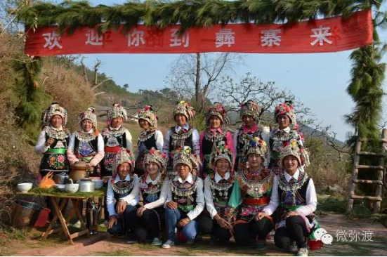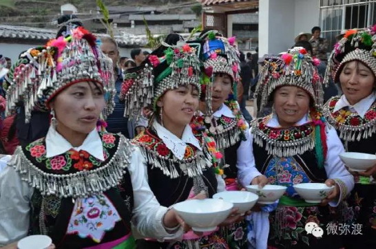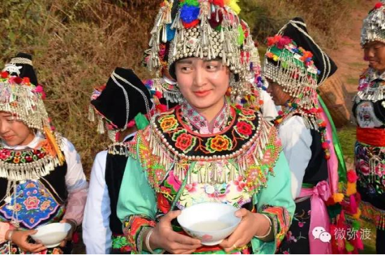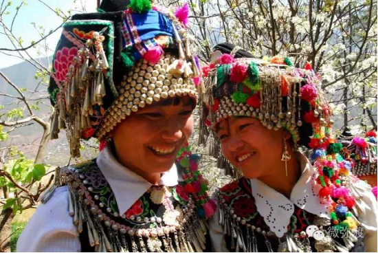 “羅羅潑支”男女服飾的特點:“羅羅潑”男子服飾與“迷撒潑”相差無幾,一般不戴白頭巾。但是婦女的服飾相差卻很大,明顯保留著古樸高雅的南詔遺風。頭飾由桂花、包頭、飄帶、大墜子、蜜蜂墜、芝麻鈴組成。桂花墊子在裱布上蒙黑色面料,中間訂有銀飾。包頭以黑色為主,長約2米,后鏈系于包頭,鏈子為銀制。飄帶長約4尺,黑色留花邊,兩頭訂英蘇。包頭還系有大墜子、蜜蜂墜各一對,芝麻鈴20個。領合由裱布黑色面料上訂芝麻玲20個圍在脖子上。圍腰的前胸部,由領口至腹部,左右各垂掛一條綴有串珠、針筒、響篾(口弦)一類飾品和生活用品的銀質(zhì)項鏈。人一走動,全身的小蘇鈴就響,聲音悅耳動聽,形象美觀大方。額頭前還圍有一塊翠綠色的“桂花綁”,綁上釘有銀質(zhì)小泡泡200多顆,羅羅潑支婦女的服飾彰顯華麗之美。