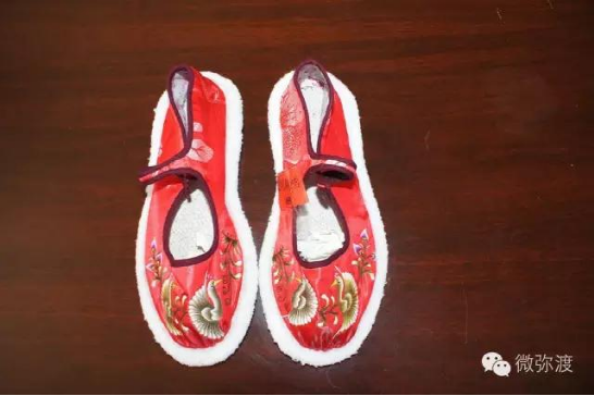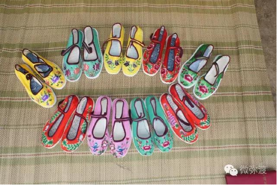 繡花鞋分大口鞋、小口鞋兩種。大口鞋大方素雅,小口鞋古樸艷麗?;佑小胺遐s梅”、“喜鵲登枝”、“獅子滾雪球“、“鳳穿牡丹”和彝族人民結婚時候,按當?shù)仫L俗所需必須穿的“毛邊底”等。這些花樣圖案具有不為時代變幻所動的恒久性質(zhì),蘊藏著濃厚的傳統(tǒng)民俗文化。它給予人們的絕不僅僅是絢麗悅目的美感,還是彝民們征服自然,繁衍生息,爭取愛情和歡樂的記錄。