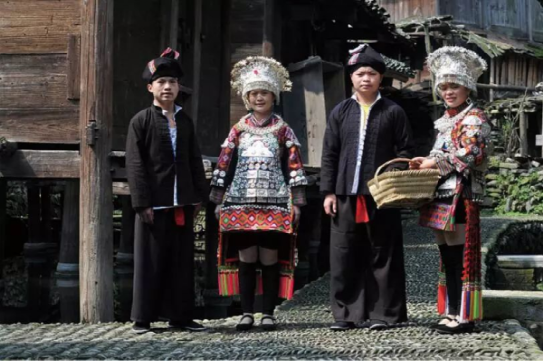 西江型盛裝,系長裙服飾上裝分內(nèi)層和外層款式為交襟大領衣,領向后傾衣袖、衣襟、衣領為刺繡裝飾部位圖案多為雙頭龍、蝴蝶媽媽宗廟及各種花、鳥、魚、蟲等