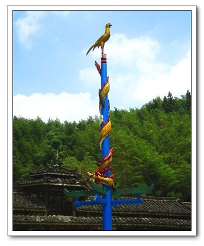 龍模型。纏著柱子尾朝上頭朝下的龍,那是出于苗族龍圖騰。意思是地上的龍,水里的龍,都朝著我們寨子來,我們寨吉祥大利,人畜興旺,五谷豐登。