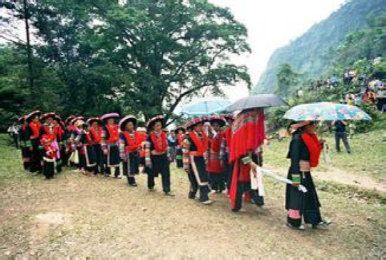 這里的"女婚男嫁"特點,大體上有這么幾個階段。當(dāng)男女青年都長到18歲后,就開始講究修飾,喬裝打扮一新,女青年似花蕊朵朵,男青年個個英俊瀟灑。通過趕街、走親訪友、耍老表、節(jié)假日唱山歌,打陀螺,拋毽子等方式,進行談情說愛,互相了解,這是認(rèn)識階段。在認(rèn)識基礎(chǔ)上,雙方互請到家做客,彼此進一步掌握對方為人、性格,家庭成員,家庭經(jīng)濟等情況。這是加深認(rèn)識、了解、建立愛慕之情階段。每逢農(nóng)忙季節(jié)和節(jié)假日,女方總要請男方來幫助犁地、耙田,耕種,收割,蓋房子等,這是考察對方勤勞能干還是好逸惡勞階段,是最關(guān)鍵的階段經(jīng)過一兩年的交往接觸,雙方產(chǎn)生了深厚感情,女方就偷偷買布,精心地打好精致的布鞋送給男方,男方收到信物后,就選擇買手鐲、頭簪、戒指,耳環(huán)或手表等其中的一兩件送給女方,彼此作為定情物,確定自己的心上人。但是,這些交往仍然是在秘密的條件下進行,屬保密階段。經(jīng)過以上四個階段以后,女方便請男方派老人帶上幾斤酒,糖,一些煙餅等禮品來訂親,要求上門,將婚事公布于眾,從這以后,女方就負(fù)責(zé)籌備一切嫁妝、床上用品、家具等。待東西備齊,女方就擇日接男方過門。