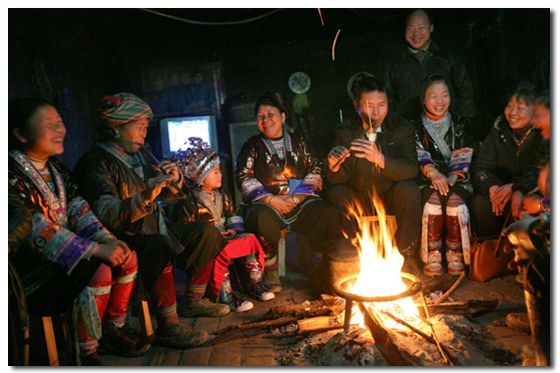 苗族起木樓很注重火塘的設置,特別留出二樓正中的大半廂作火塘?;鹛劣脤捄窭仙寄景彖傊瞥梢粋€長寬約一點五米,深約六十公分的正方形木槽,槽內(nèi)用粘性強的黃泥巴填滿舂緊,正中央安放有三腳鐵架,用于架鍋煮食?;鹛潦侵蟪?、進餐、取暖、會客、議事、祭祀的地方,又是年輕人走妹行歌、談情說愛、舉行婚禮儀式的場所。因此苗家人對火塘是十分看重的。