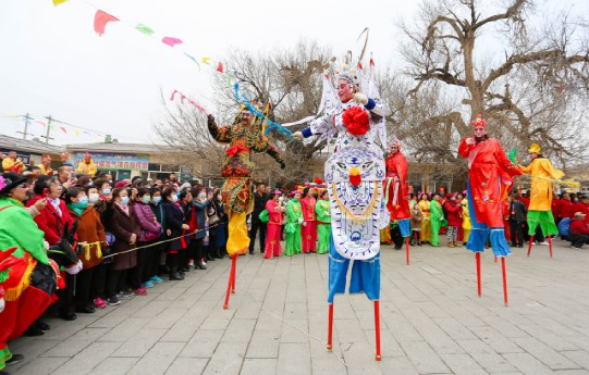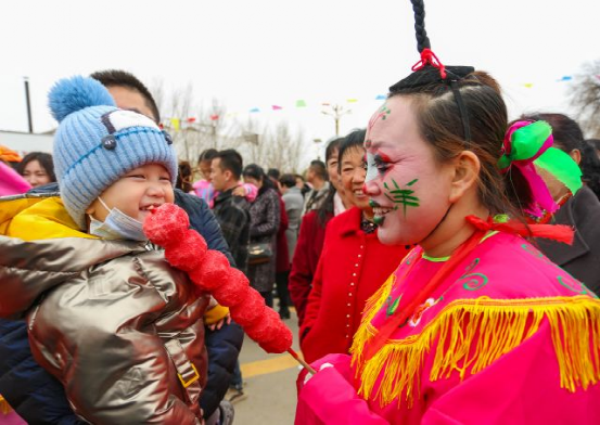 踩高蹺、秧歌、舞獅、腦閣、天倉舞、二人臺.....一個個精彩紛呈又獨(dú)具特色的民間傳統(tǒng)表演吸引著十里八鄉(xiāng)的村民和慕名而來的市民。大家或跟著哼唱著民間小曲,或拿出手機(jī)拍攝精彩演出,一個個寫滿了幸福的笑臉在討思浩村廣場競相綻放。