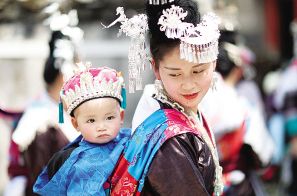 村民背著小孩參加盛裝巡游。
