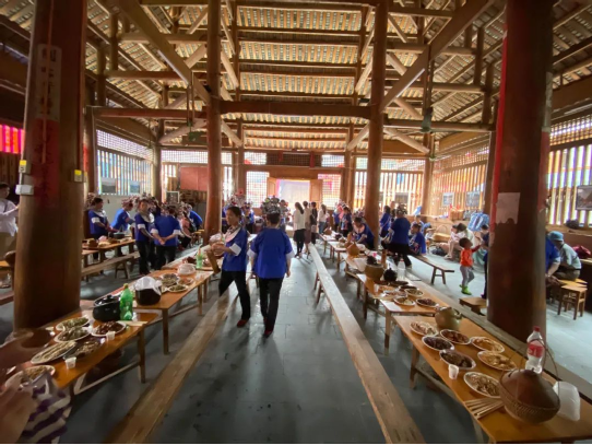 “百家宴”是侗族待客的最高禮儀。每逢村寨互訪或有特別尊貴的客人來(lái)時(shí),全村各戶自備酒菜飯,一起到鼓樓坪“一”字型擺開長(zhǎng)桌,客人可從第一桌吃到最后一桌,你來(lái)我往、觥籌交錯(cuò)、熱鬧非凡。據(jù)說(shuō)在當(dāng)?shù)亓鱾髦@樣一個(gè)說(shuō)法:“吃百家飯、納百家福、聯(lián)百家心、驅(qū)百家邪、成百樣事、享百年壽”——各寨