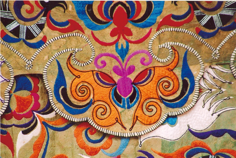 在苗族各種工藝的服飾圖案中,蝴蝶是俯拾皆是的,而丹寨縣雅灰鄉(xiāng)和榕江縣高排鄉(xiāng)等地的苗族百鳥(niǎo)衣上,大面積地使用絲帛和絲線刺繡,常在中心位置繡著一種奇特造型的動(dòng)物圖案,頭是變形的鳥(niǎo)頭,身是蟲(chóng)身,有節(jié),周?chē)秋w舞的蝴蝶。不少人解釋它為龍。其實(shí)那是蠶蟲(chóng)、鳥(niǎo)、蝴蝶的結(jié)合:蝴蝶——鳥(niǎo)——蠶蟲(chóng)——一幅圖本身就包含了蝴蝶圖騰的全部寓意。