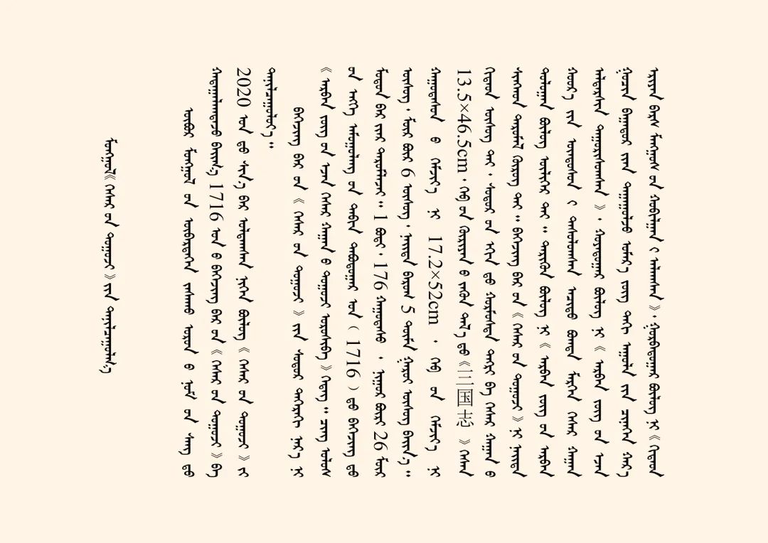 今天我們主要講述的是1716年北京木刻本蒙古文《格斯?fàn)杺鳌罚ㄈQ為《十方圣主格斯?fàn)柨珊箓鳌罚┦乔蹇滴跷迨迥辏?716)北京木刻本。梵夾裝,1卷(176葉),每頁26行,每行6個(gè)字,約5萬多字,頁面高17.2cm、寬52cm,版框高13.5cm、寬46.5cm。版框左側(cè)有漢文《三國志》三字,首頁刻有朱印佛像。