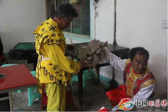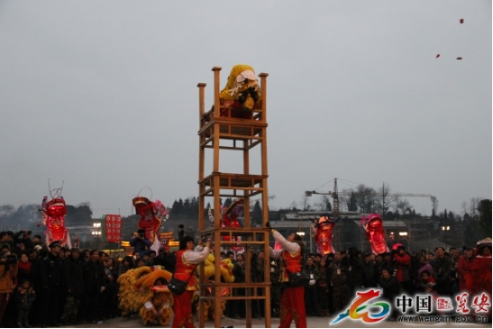 高臺(tái)是用5至7張八仙桌一層層疊壘,最上面的桌子四腿朝天,總高度近8米。四人登臺(tái)表演。兩個(gè)人扮獅子,把獅頭獅皮披在身上,只露雙腳;另外兩人分別裝扮成孫悟空和笑臉和尚揮舞手帕,大蒲扇逗引獅子逐層攀上高臺(tái),為了穩(wěn)固,安全起見,每張桌子的四角都用草紙疊浸水后墊著防滑,做到萬無一失。