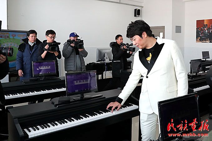 在“快樂的琴鍵”音樂教室捐贈儀式上,朗朗與內(nèi)蒙古藝術(shù)劇院直屬烏蘭牧騎演員聯(lián)合表演了《鴻雁》。