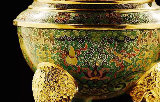 此時(shí)的景泰藍(lán)不僅繼承了明代豪華、古典、雅致的民族風(fēng)格,而且鍍金技術(shù)更為發(fā)達(dá),器物表面多飾以珍貴寶石,鍍金厚重光亮,寶石燦爛奪目,二者相得益彰,充分體現(xiàn)了皇家的雍容氣派。
