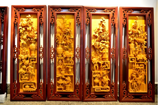 《四條屏掛件》脫胎于“格子門”的上裙板,是由實用到觀賞的一種很好的轉(zhuǎn)換,是目前最走俏的新產(chǎn)品,無論是賓館客廳或居家,古樸典雅的木雕“四條屏”會增添不少東方文化的雅趣,越來越受到人們的喜愛,許多人都把它作為木雕藝術(shù)珍品收藏。為了給世人留下藝術(shù)精品,許多工藝師潛心研究設(shè)計、精心雕刻,用半年、甚至一年多的時間才完成一件“四條屏”。這些精心之作,疏密有致、變化統(tǒng)一,構(gòu)圖飽滿,穿插纏繞,重重疊疊的層層透雕,無不凝聚著制作者的智慧與心血。《四條屏》的圖案設(shè)計,主要有三種內(nèi)容:(1)博古;(2)花卉;(3)花鳥。人物、山水類型的極少。圖案喻意與格子門相近。
