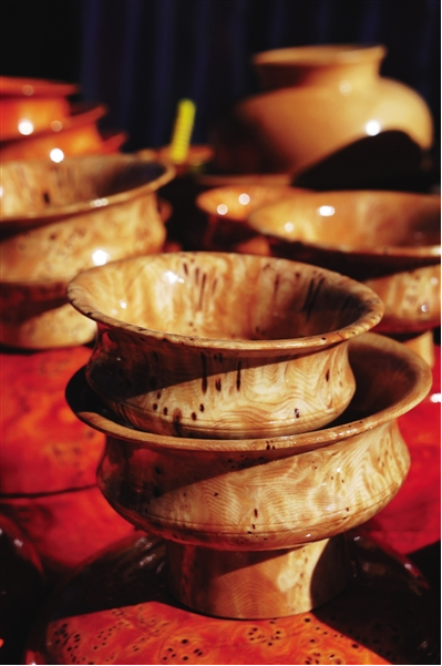 官員們使用的木碗,固然也非常注重外面的金銀寶石包裹,而木碗本身,也有一套非常固定的學(xué)問,盛開水不裂,摔到地上不會破,不燙手不冰手,體輕而質(zhì)固,經(jīng)久耐用,可以爺孫相傳。用這種碗盛食,可以完全保持食物原味,吃酥油糌粑等油肉類食品猶為適宜。比之于一般瓷碗,是碗中上品。這種木碗一般都是選用一些稀有雜木的節(jié)或者根雕琢而成,除了材料本身,在加工過程中的工序也十分重要,必須要加工出來一些獨特的花紋,比如磷火紋,或豬鬃紋,或貓頭鷹眼紋等,有這種花紋的碗,就要格外名貴,比如這次普布次仁兄弟所制作的大型核桃木碗,全身均勻地布滿了貓頭鷹眼紋,所以才能賣出這么高的價格。在西藏很多地區(qū),都流傳著這樣一個諺語:“一只上等木碗等于10頭牦牛?!?/p>