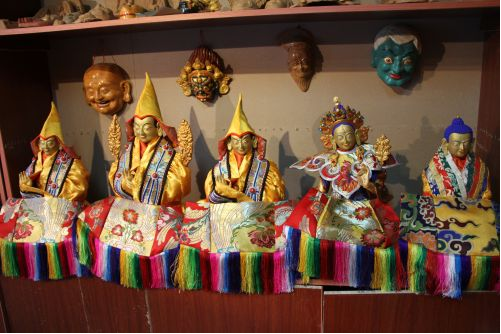 在普布次仁所在的公司里,有一個專門用來制作泥塑面具的房子,從外表上看去,它只是一個普普通通的藏式民居,但走進其中,則別有一番天地。在房間里整齊擺放了大大小小的泥塑面具、佛像,這些手工藝品造型生動,每一件手工藝品仿佛都在訴說著一個古老、動人的故事。