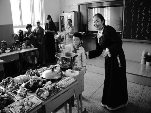 圖為孩子們在上傳承民族文化特色展示課。奶茶原為中國北方游牧民族的日常飲品,至今已有千年歷史,蒙古奶茶至今仍然是日常飲用及待客的必備飲料。陳巴爾虎旗民族小學開展了具有濃濃的民族風味的實踐活動課,通過一起熬制奶茶,學生和家長、老師們都受益匪淺。