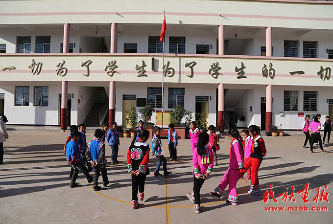 看過臘灣民族小學(xué)課間操的人都會說:“臘灣民族小學(xué)的課間操都是跳出來的。”然而,對于這所雙語教學(xué)的民族小學(xué)來說,其民族特色遠(yuǎn)不止于此。穿彝族傳統(tǒng)服裝、講彝語也是這里的教育特色。