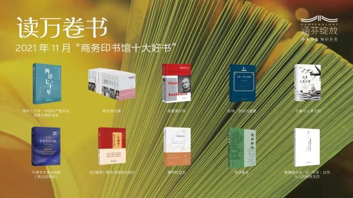 2021年11月“商務(wù)印書館十大好書”8日晚在直播間發(fā)布,《兩岸七十年:中國共產(chǎn)黨對臺決策與事件述實》《陳志華文集》《波德萊爾傳》《法律、自由與道德》《元素與人類文明》《牛津?qū)W術(shù)英語詞典(英漢雙語版)》《<紅樓夢>整本書閱讀與研討》《善終的藝術(shù):應(yīng)對衰老、病痛、死亡的實用指南》《荀學(xué)新論》《萊奧納爾多·達·芬奇:自然與人的驚世杰作》入選。
