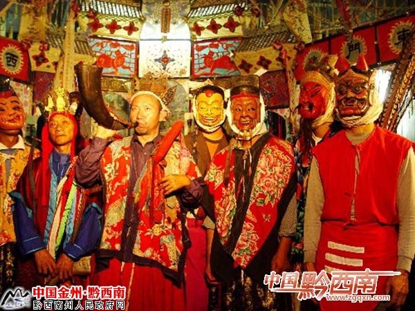 生活在黔西南州貞豐、晴隆、普安、望漠、冊(cè)亨、安龍、興義等8縣市的20萬苗族同胞的先民,在遠(yuǎn)古時(shí)代“信鬼不信神”,認(rèn)為人的靈魂不滅,祖先死后靈魂仍在,可以保佑子孫后代。因此,苗族先民往往祈求祖先,助其實(shí)現(xiàn)心愿,一但酬愿便要祭祀祖先,俗稱“還儺愿”。還愿時(shí)舉行的儀式就是儺儀。還儺愿主要由苗巫師主持,跳儺時(shí)配以唱、念及動(dòng)作,儀式非常莊嚴(yán)肅穆。明末清初民間藝人開始將“還儺愿”的部分內(nèi)容整理、加工、完善后搬上舞臺(tái),便成了儺戲。因此說,儺戲是從莊嚴(yán)的祭祖儀式脫胎而成的一種獨(dú)具特色的地方曲目。儺戲沒有管弦樂,但有節(jié)奏明快的鑼鼓伴奏,曲調(diào)流暢悅耳,劇情風(fēng)趣詼諧,更具有濃郁神秘的苗族文化色彩,深受苗族同胞的喜愛。