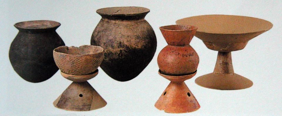 彌生時代的名稱,源自1884年東京市本鄉(xiāng)彌生町“彌生陶器”的發(fā)現(xiàn)。彌生陶器與繩紋陶器截然不同,為素面,灰色。日本人認(rèn)為彌生陶器是“渡來人”制造的?!岸蓙砣恕笔侵袊箨懲ㄟ^朝鮮半島而來,他們帶來了陶器的制作技術(shù)。彌生陶器為深釜器,以甕形器、缽形器、高腳杯(豆形器)為主(圖五)。