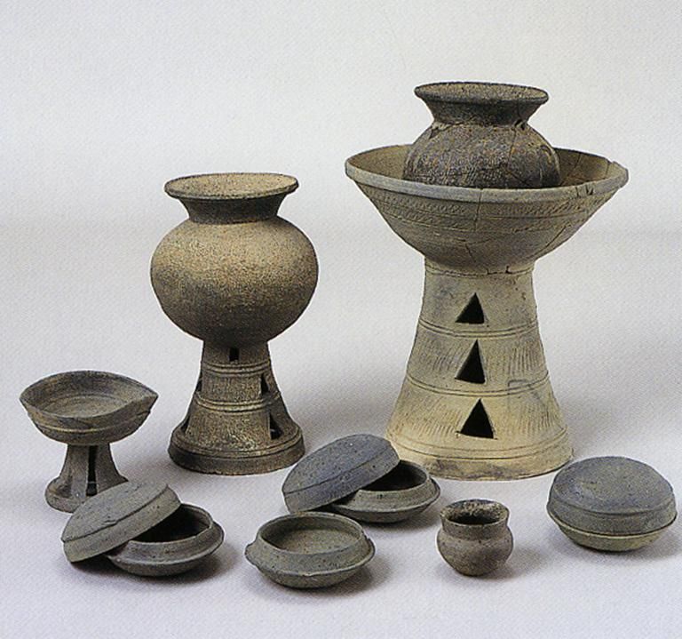 古墳時期另一種陶器為須惠器(圖十二),比土師器精美。它在古墳時代中期才從大陸引進(jìn)而來,由朝鮮半島的“陶部”工人在相對集中的場所制作,采用輪制技術(shù),器物呈青灰色,器形富于變化,主要為壺、瓶、盤、碗和高腳杯等。
