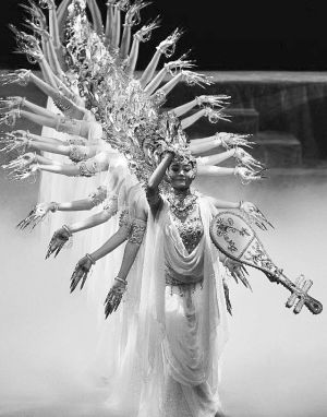 在敦煌舞的動作素材積累方面,無論是對敦煌壁畫舞姿的歸類、整理,對“敦煌舞特有的S型曲線運(yùn)動規(guī)律”的發(fā)現(xiàn),以及“運(yùn)用中國古典舞蹈的節(jié)奏韻律,把靜止的姿態(tài)與其風(fēng)格統(tǒng)一的動作過程結(jié)合起來,形成比較完整的舞蹈運(yùn)動和造型體系”,還是在創(chuàng)作層面上《絲路花雨》對“反彈琵琶”典型壁畫舞姿的發(fā)展,《千手觀音》對“千手”舞姿造型的無限變化發(fā)展,以及《飛天》超越人體動作范圍極限對“三道彎”典型敦煌舞姿風(fēng)格的強(qiáng)化等,都是敦煌舞在動作素材層面的積極建設(shè)和發(fā)展。