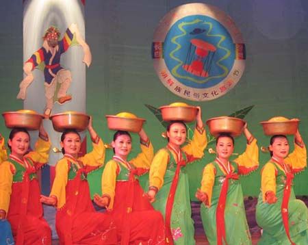 頂水舞因舞者頭頂水罐起舞而得名,是朝鮮族女性表演的傳統(tǒng)舞蹈。朝鮮族婦女習(xí)慣用頭部頂著器物行走,在插秧、鋤草季節(jié),婦女們常頭頂水罐將飲水或米酒等送至田間地頭。頂水舞即在這種生活習(xí)俗基礎(chǔ)上形成,而且一經(jīng)形成,便在群眾中間廣泛流傳。上世紀(jì)50年代初期,頂水舞在延邊各地隨處可見,成為當(dāng)?shù)厝罕娮顝V泛的民間舞蹈之一。舞者頂?shù)乃蓿巧钪械膶?shí)物,后來為了便于起舞,多用紙糊的罐型道具,在表層上繪以漂亮的花紋,輕巧別致。隨著道具變化,舞蹈動(dòng)作也相應(yīng)發(fā)展。頂水舞以“挫墊步”“踏波步”“碎步”為基本步伐,主要?jiǎng)幼饔小疤鹑ㄋ薄坝裰笍椫椤钡?。舞蹈通過模擬頂罐行進(jìn)中的各種動(dòng)作,抒發(fā)歡樂喜悅的內(nèi)心感情,舞姿輕松優(yōu)美。