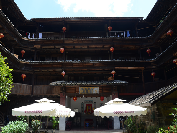 1995年它的建筑模型與北京天壇作為中國(guó)南北圓形建筑代表參加了美國(guó)落杉磯世界建筑展覽會(huì),引起了轟動(dòng),被譽(yù)為“東方建筑明珠”。 客家土樓建筑閃耀著客家人的智慧,它具有防震、防火、防御多種功能,通風(fēng)和采光良好,而且冬暖夏涼。它的結(jié)構(gòu)還體現(xiàn)了客家人世代相傳的團(tuán)結(jié)友愛傳統(tǒng)。試想幾百人住在同一幢大屋內(nèi)朝夕相處,和睦共居當(dāng)然是非常重要的,客家人淳樸敦厚的秉性于此也可見一斑。一進(jìn)入土樓,你立即就能感覺到那種深沉的歷史感和溫和的氣氛。 全樓的設(shè)施布局既有蘇州園林的印跡,也有古希臘建筑的特點(diǎn)??胺Q中西合璧的建筑奇葩 。