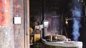 鏡頭的取景框內(nèi),青菜在“古井”潺潺流水中淌去泥沙,沿著苔蘚步道,裝在背簍里被送入小院;陽光透過窗欞灑下,熏黑的灶臺,柴火劈啪作響,趁著火候,幾下翻炒,白霧便混合著農(nóng)家飯香騰騰升起。