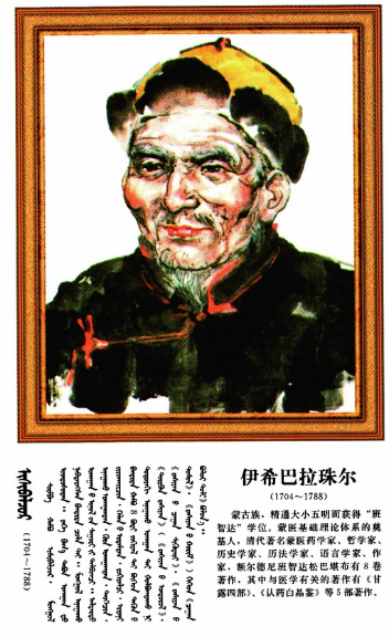 伊希巴拉珠爾(1704~1788),蒙古族,一名也協(xié)班覺、額爾德尼班智達(dá)·松巴堪布,蒙古衛(wèi)拉特人,著名蒙醫(yī)學(xué)家、文學(xué)家、天文學(xué)家哲學(xué)家。一生著作豐厚,其中對(duì)完善蒙醫(yī)理論體系有重要影響的著作有《甘露之泉》、《白露醫(yī)法從新》、《甘露點(diǎn)滴》、《甘露匯集》和《認(rèn)藥水晶鑒》,在這些著作中他將藏醫(yī)學(xué)理論與蒙古人的體質(zhì)、生活習(xí)俗、居住地區(qū)的地理、氣候條件等具體實(shí)際結(jié)合在一起,進(jìn)行創(chuàng)造性的理論研究,不僅豐富了臨床實(shí)踐的內(nèi)容,而且補(bǔ)充和完善了蒙醫(yī)學(xué)的理論體系,他將傳統(tǒng)蒙醫(yī)學(xué)“寒熱理論”與《四部醫(yī)典》中關(guān)于寒熱病理論的闡述進(jìn)行有機(jī)結(jié)合,使之成為近代蒙醫(yī)學(xué)病性辯證的總綱,同時(shí),他也闡述了將六基癥作為病因鑒別診斷的核心及其臨床表現(xiàn),使“六基癥”學(xué)說從理論到實(shí)踐都獲得了比較系統(tǒng)的發(fā)展。占布拉道爾吉是19世紀(jì)著名的蒙藥學(xué)家,他編著的《蒙藥正典》(又名嗚嗚蒙藥圖鑒)共收載蒙醫(yī)臨床常用藥物879種,按礦物、植物和動(dòng)物等分為8部24類,附插圖576幅,對(duì)每種藥物的產(chǎn)地、形態(tài)、性味、功能、入藥部分、采集加工、炮制方法、主治、用法等都闡述詳盡,并且每一味藥物都標(biāo)寫了蒙、藏、滿、漢四種文字的藥名,具有很高的參考價(jià)值。該書還附有外科術(shù)療器具圖解,以及放血穴位、針灸穴位、人體各部分劃分圖解說明等。敏如爾古布拉(1789-1838)編撰了蒙醫(yī)學(xué)方劑巨著《方?!?,是一部比較系統(tǒng)完整的蒙醫(yī)藥物方劑學(xué)經(jīng)典著作,收載方劑近200種,分為76章,進(jìn)行詳盡的論述和評(píng)點(diǎn),同時(shí)對(duì)相關(guān)疾病的病因、病機(jī)、分類和治法等也做了簡要論述。