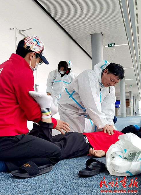 烏日根桑格利用在機(jī)場(chǎng)轉(zhuǎn)機(jī)時(shí)間,為國家柔道隊(duì)運(yùn)動(dòng)員進(jìn)行調(diào)整治療。