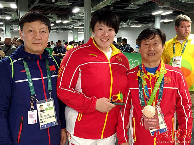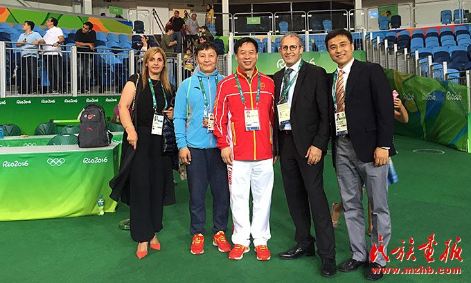 2016年,里約奧運(yùn)會(huì)期間,烏日根桑格(左)與中國國家柔道隊(duì)隊(duì)員于頌(中)、國家柔道隊(duì)原主教練程志山合影留念。