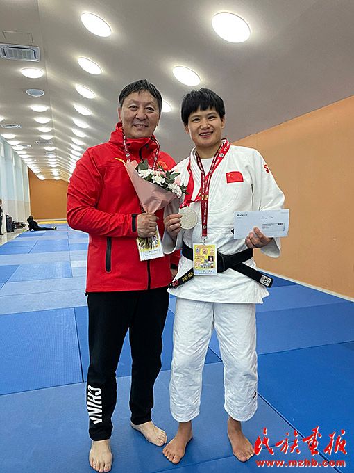烏日根桑格(左)隨國家柔道隊(duì)參加 2021年世界柔道大滿貫比賽。圖為與國際級(jí)運(yùn)動(dòng)健將、國家柔道隊(duì)隊(duì)員楊俊霞合影留念。