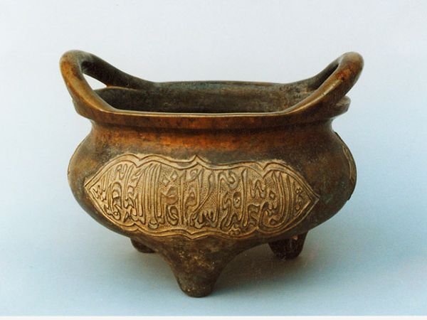 侈口、方唇、窄卷沿、矮束頸、扁鼓腹,口沿立一對橋形耳,底部以矮小的三乳足支撐整個爐身。外腹壁兩大兩小四組開光內(nèi)均以珍珠紋為底,陽刻有阿拉伯文字,漢譯為:“最貴的記主詞(吉克爾)是念清真言(萬物非主,唯有真主,穆罕默德是真主的使者)”,底款漢文四字篆書“宣德年制”。阿拉伯文構(gòu)成此爐的主體紋飾,圖案別致,內(nèi)涵深奧,寓意獨(dú)特,雕刻手法精細(xì)、嫻熟,線條婉轉(zhuǎn)流暢,自然雅致,具有韻律之美。該器物銅質(zhì)精良,造型優(yōu)美,工藝考究,將冶鑄、雕刻技術(shù)與阿拉伯文書法絕妙融合,堪稱回族文物中的珍品。