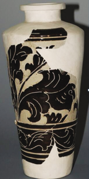 西夏經(jīng)瓶是靈武窯最具特色的西夏器類之一,其器型瘦長(zhǎng),肩部最寬,下腹?jié)u收,平底,假圈足;胎質(zhì)細(xì)膩致密,外壁施釉均不到底,內(nèi)壁施滿釉,釉色以褐釉為主,也有黑釉,白釉少見,白釉瓷均施化妝土;紋飾以牡丹花為主,也有菊花,少見海棠花,輔紋以海水波浪紋和斜線紋為主,花紋細(xì)膩,構(gòu)圖流暢,疏密得當(dāng);整體構(gòu)圖大量使用開光,搭配合理,講究對(duì)稱。