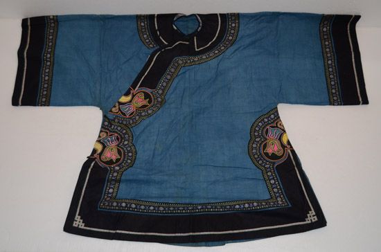 分布在凱里、雷山、丹寨、麻江四縣交界地一帶苗族村寨,以凱里舟溪苗族為代表。該服裝上衣為緞面對襟衣,刺繡主要在肩袖及袖口部分,以黔東南苗族特有的繭片繡為主,所繡圖案為浮萍花和幾何紋,肩部和背部鑲有銀泡和銀片,具有民族特點(diǎn) 。前、后圍腰片均以繭片繡為主,所繡圖案為浮萍花和幾何紋。