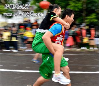 在昌江黎族自治縣一帶流行。每年的農歷十五前后,孩子們就聚居在一空曠地,舉行村與村之間比賽??筛鶕?jù)人數(shù)來分組,每組2人(一男一女),每次由兩組進行,實行淘汰制,男背著女或女背著男亦可,與對方互相碰撞,男女通過踢、拉、推等動作,千方百計地把對方背著的人或拉下,或把兩人分開,或倒地。在場觀看的人興高采烈,笑聲不斷,其樂無窮。