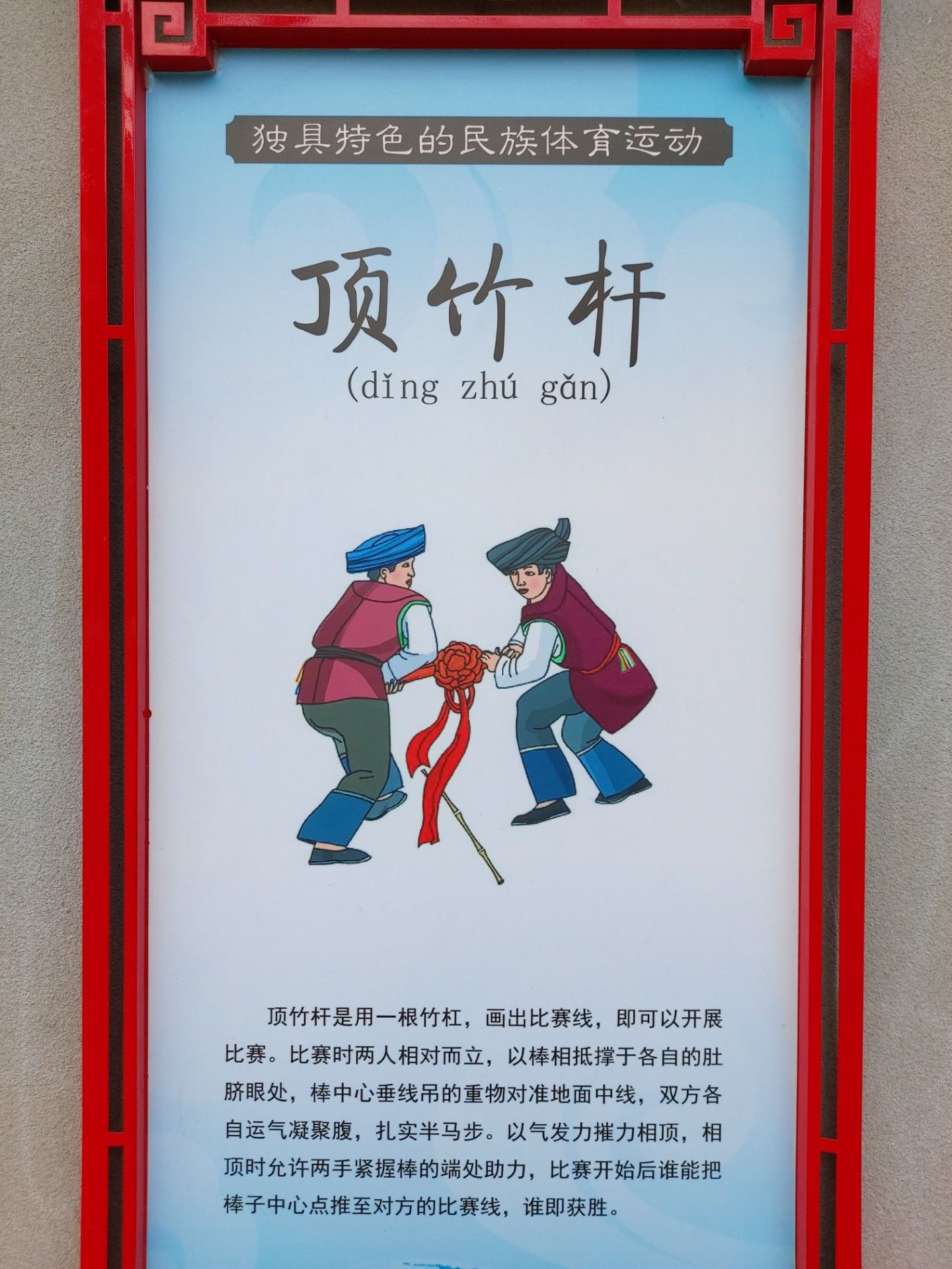頂竹桿是用一根竹杠,畫出比賽線,即可以開展比賽。比賽時(shí)兩人相對而立,以棒相抵撐于各自的肚臍眼處,棒中心垂線吊的重物對準(zhǔn)地面中線,雙方各自運(yùn)氣凝聚腹,扎實(shí)半馬步。以氣發(fā)力摧力相頂,相頂時(shí)允許兩手緊握棒的端處助力,比賽開始后誰能把棒子中心點(diǎn)推至對方的比賽線,誰即獲勝。