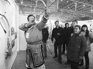 日前,在北京舉行的非遺生產(chǎn)性保護(hù)成果大展上,幾名觀眾圍攏在一個(gè)身材魁梧的錫伯族老人周圍,但見(jiàn)他身罩長(zhǎng)袍,足踏薄底靴,雙目圓睜,兩臂運(yùn)力搭弓上箭,儼然就是準(zhǔn)備步射的驍將。這位老人就是錫伯族傳統(tǒng)弓箭技藝傳承人伊春光,老漢手中的弓重近1公斤,是他親手制作的。