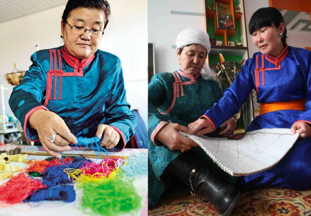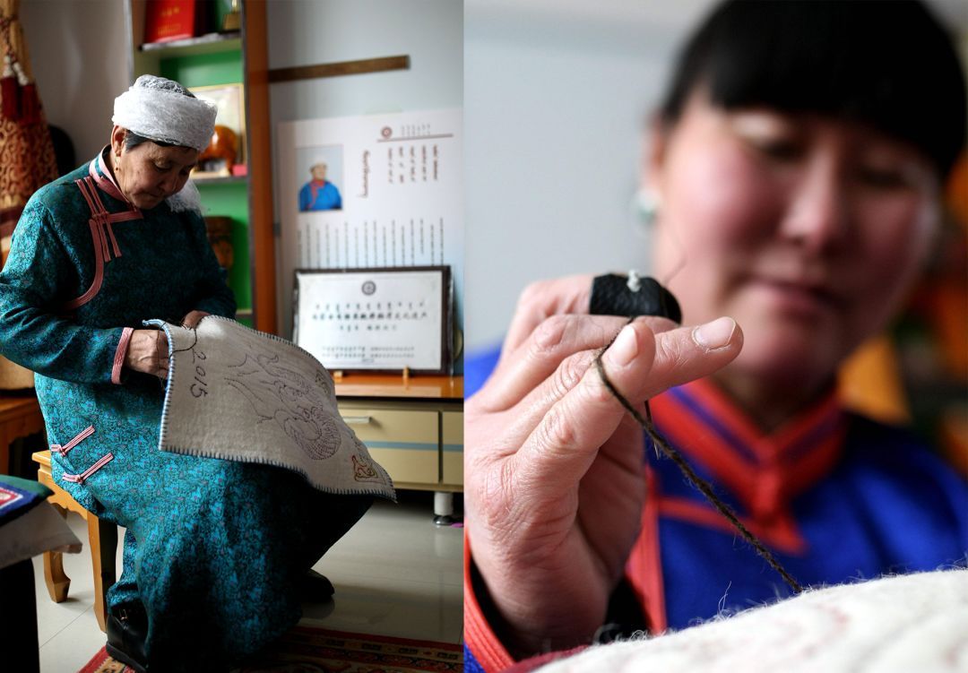 蒙古包穹頂?shù)絻?nèi)壁,從門(mén)簾到地上鋪的毛氈,從日常家居的蓋布到商旅使用的茶鹽袋,蒙古族人將細(xì)膩的各式花樣運(yùn)用在食衣住行的各個(gè)方面。而這些精美絕倫的裝飾都有一個(gè)共同的名字,那就是蒙古族氈繡技藝。