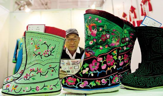 傳統(tǒng)的氈繡工藝品包括吉祥圖案、花紋圖案、五畜圖案、鮮花飛鳥(niǎo)、蒙古包門(mén)、氈包帡幪、馬鞍屜、氈靴(氈襪)、坐墊、各種繡花氈囊、拾羔袋、駝鞍等。