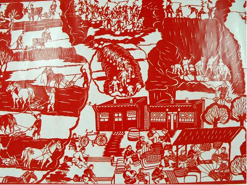 2、達拉特紀事剪紙的歷史價值很高,《農(nóng)民紀事圖》上卷記載了從建國到現(xiàn)在農(nóng)村的發(fā)展變化,在作品中我們看到了很多瀕臨失傳的農(nóng)村生產(chǎn)生活工具和生產(chǎn)方法,也能看到黨和國家在每一年出臺的各項惠農(nóng)利民政策,對于研究歷史具有重大的文獻價值。