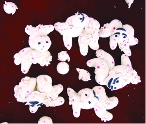 制面塑的工具比較簡單:有剪刀、菜刀、梳子、紅棗、花椒、紅豆等物。只要掌握好發(fā)面技術(shù),按照式樣進(jìn)行捏制,那么一個鮮活的面模形象就會脫穎而出。面塑的藝術(shù)的特點(diǎn)是“一印、二捏、三鑲、四滾”另外還有“文的胸、武的肚、老人的背脊、美女的腰”。