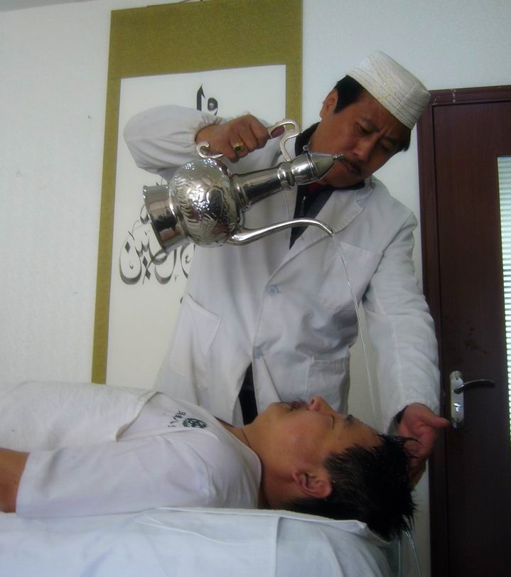 湯瓶八診療法,包括頭診、耳診、面診、手診、腳診、骨診、脈診、氣診八種療法,與現(xiàn)代經(jīng)絡學有相同的哲學思想。因人而異,運用不同的經(jīng)脈、竅穴診療。它主要是依據(jù)回族醫(yī)學基本理論,運用湯瓶水浴、末稍經(jīng)絡根傳法、放血、刮痧、火罐等湯瓶的基本手法,并結(jié)合穆斯林視為神圣的“杜阿伊”,分別作用于受施者身體的不同部位,操作者通過受施者的各種反應,即可判斷疾病之所在,進而調(diào)整施術(shù)的治療手法、輕重程度和次序頻率等,從而使受施者達到提高免疫機能、防病治病的目的。