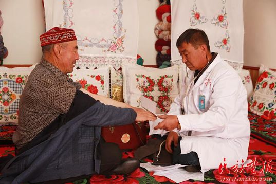 居馬泰·俄白克說,我只有一個想法,就是盡己所能為更多牧民解除病痛。“不管病人有錢沒錢,我都要先把病看好”。從醫(yī)20多年來,他個人為牧區(qū)牧民減免的醫(yī)藥費(fèi)等已超過10萬元。而居馬泰·俄白克一家五口的生活,全靠他一個人的工資。他因過度勞累,患心臟病,不適合在高原工作。當(dāng)?shù)匦l(wèi)生局領(lǐng)導(dǎo)準(zhǔn)備把他調(diào)至農(nóng)業(yè)村,但是他都婉言謝絕了。妻子動了5次手術(shù),他都因為在牧區(qū)巡診,沒有陪伴過,孩子還小,家里的重?fù)?dān)都讓妻子承擔(dān),說起這些,居馬泰·俄白克心里很愧疚。