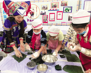 廣西南寧市南師附小把民族團(tuán)結(jié)教育融入日常教學(xué)中。圖為老師和同學(xué)們一起制作傳統(tǒng)美食。叢蓉?cái)z