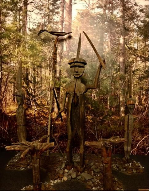 展區(qū)內(nèi)還放置著一組木質神偶,這些神偶來自赫哲族部落。佇立在最中間的神偶起著山神的作用,面目清晰與人等高,手中舉著木劍,挖空的腹部能吞掉妖魔鬼怪,一顆碩大的心臟代表強悍的法力,靠墻斜放著一根高高的木桿,頂端棲息著一只鳥(喬卡鳥)。
