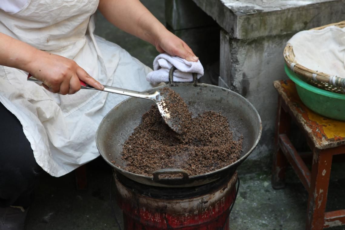 清明粑餡心的原材料,包含百分之五十的蘇麻、百分之三十的花生、剩余部分是白芝麻、玫瑰糖和白糖,加工過程頗為繁瑣。黃家英將白芝麻、花生、蘇麻洗凈后,分別放入鐵鍋中翻炒,小火防止局部焦糊,不斷翻炒使得每一顆都能受熱均勻。