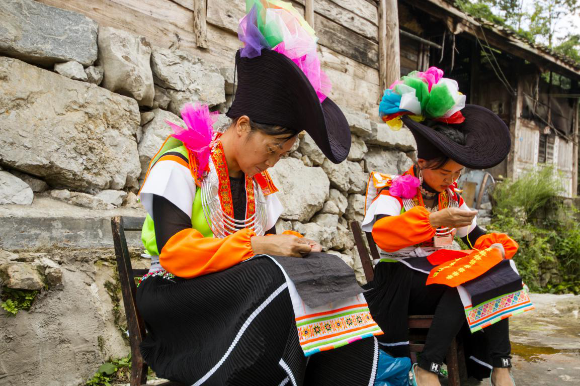 女子服飾腰間的腰帶,會(huì)連綴珠簾,給服飾整體添光加彩,使服飾整體看上去更加鮮艷亮麗。批林村人不只是在傳統(tǒng)節(jié)日當(dāng)中會(huì)穿著傳統(tǒng)服飾,在日常生活中也會(huì)穿戴象征本民族的傳統(tǒng)服飾。批林村傳統(tǒng)服飾上的圖案,都來源于自己的刺繡。批林村女子刺繡圖案的多少和優(yōu)美與否,在一定程度上,標(biāo)識(shí)了苗族婦女的勤勞能干,所以批林村苗族女子的刺繡圖案復(fù)雜變化,集優(yōu)美與實(shí)用一體,繡在傳統(tǒng)衣服上,顯得典雅大氣。傳統(tǒng)的刺繡一針一線,一穿一引,將處理好的麻布繡以幾何、花朵等圖案,以針線的方式賦予了苗族衣飾鮮活的生命力。