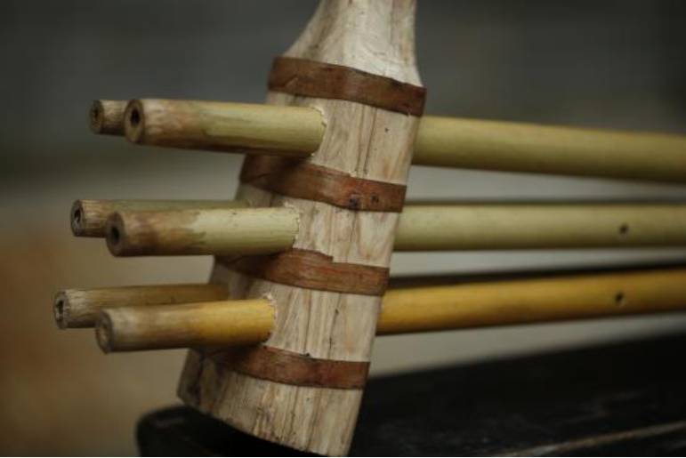 制作:蘆笙管用當(dāng)?shù)胤Q蘆笙竹的竹子制作而成,管的兩端直通(有的地區(qū)蘆笙是上通下不通),按孔為方形(有的地區(qū)為圓形),簧片制作與其他地區(qū)蘆笙一樣;共六組合,用花果樹(shù)皮作兩道箍。